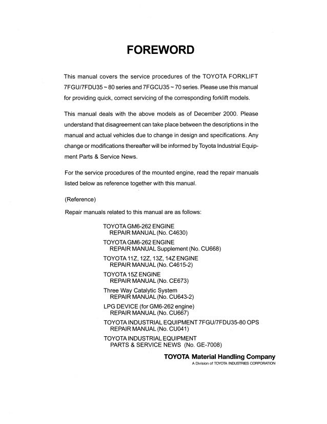 Toyota 7fdku40 Forklift Service Repair Manual